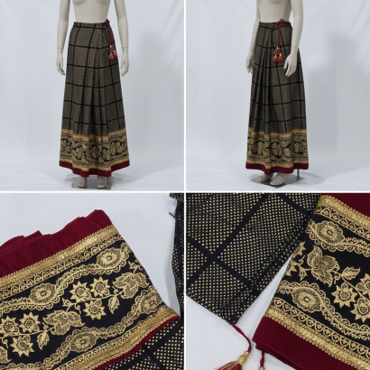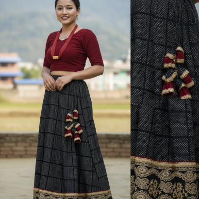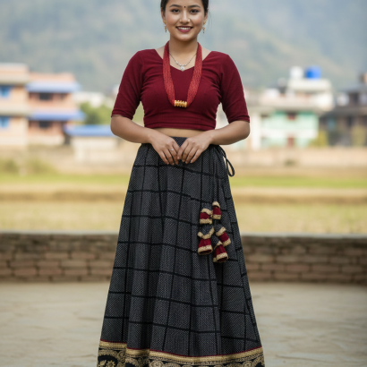 Make a statement with this Magar and Gurung Lehenga, featuring bold, handwoven patterns in deep browns, reds and golds. The lightweight fabric ensures comfort while the rich colours reflect cultural pride. Perfect for weddings, festivals, or special occasions, it pairs beautifully with a fitted blouse and traditional jewellery.