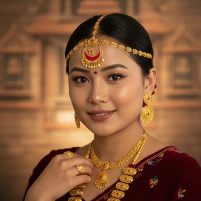 - Sirbandi: In general, a sirbandi is a traditional forehead band, often featuring intricate designs and sometimes stones. The specific “Purbeli” style may feature design elements characteristic of eastern communities like the Kirat (Rai/Limbu), Gurung, and Tamang people, who also wear other distinct “Purbeli Collections” of jewelry like the kantha mala or yarling.